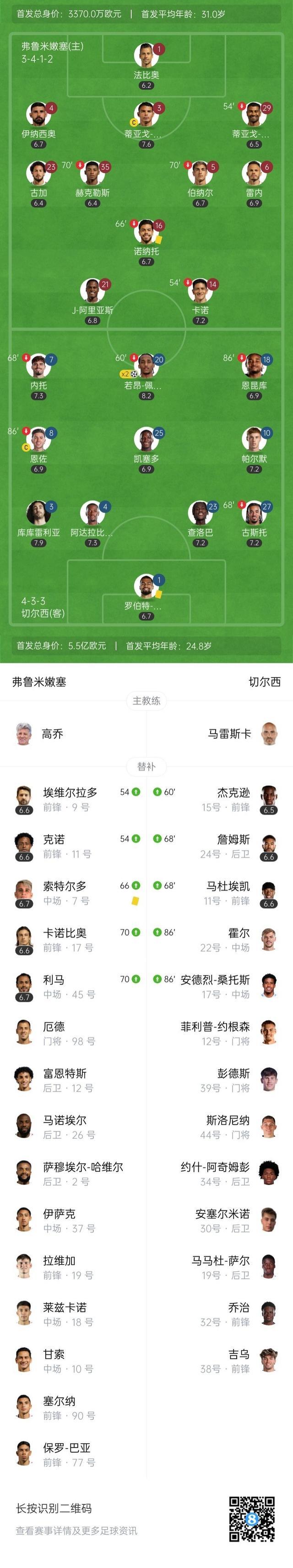 第56分钟,切尔西反击机会,恩佐中圈送出直塞,若昂-佩德罗左路得球,一路突入禁区,晃开角度后起脚爆射得手,切尔西2-0弗鲁米嫩塞。↓